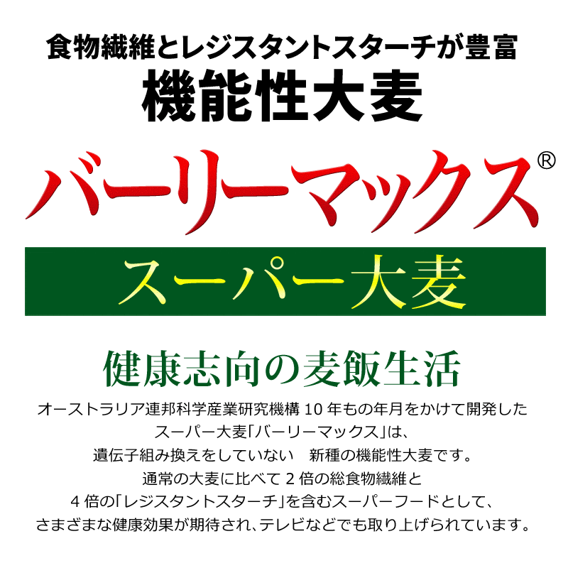 名称 バーリーマックス大麦α化玄麦 (表面研削選別済み) 原材料 大麦(オーストラリア) 内容量 180g入り×1袋 賞味期限 常温約12カ月間 保存方法 直射日光や高温多湿を避けて、常温で保存してください。