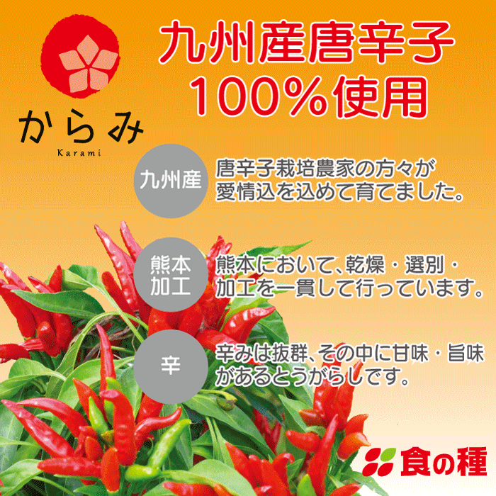名称:とうがらし加工食品 原材料名:とうがらし(九州産) 内容量:10g 賞味期限:別途ラベルに記載 保存方法:直射日光、高温多湿を避けて保存してください。